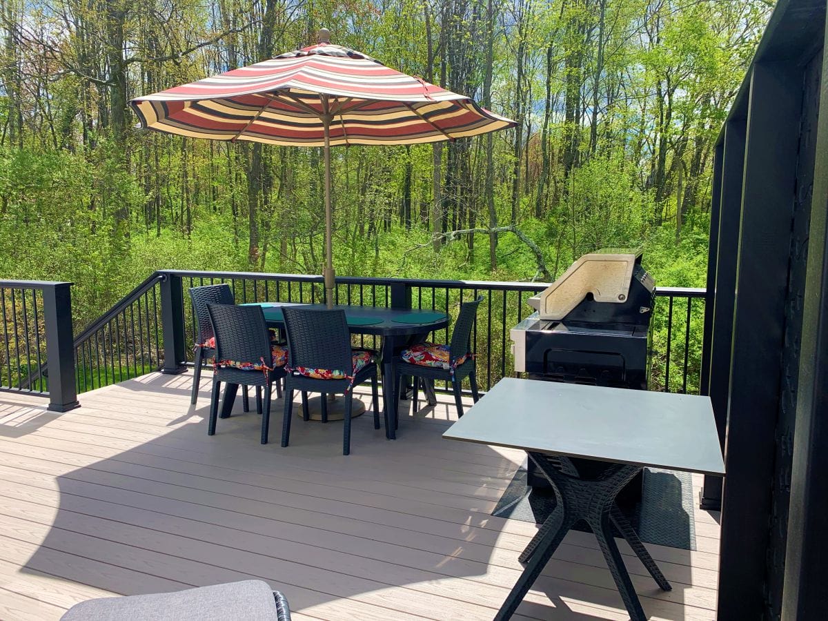 Composite decks in Salem Nh that had been renovated and furnished with a table, chairs, and grill