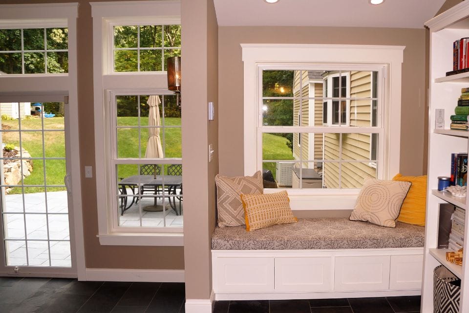 The design collaboration between our clients and their architect led to this multi-functional, energy efficient addition. To address egress on the second floor where moving windows was not an option, a small anteroom was proposed, giving the owners a perfect opportunity to add two great features, a wet bar and reading nook. Energy efficient windows and doors and mini split unit, as well as spray foam insulation, help reduce heating and cooling costs. Great views of the wooded back yard and easy access to the outdoor living space make this versatile room a great investment!