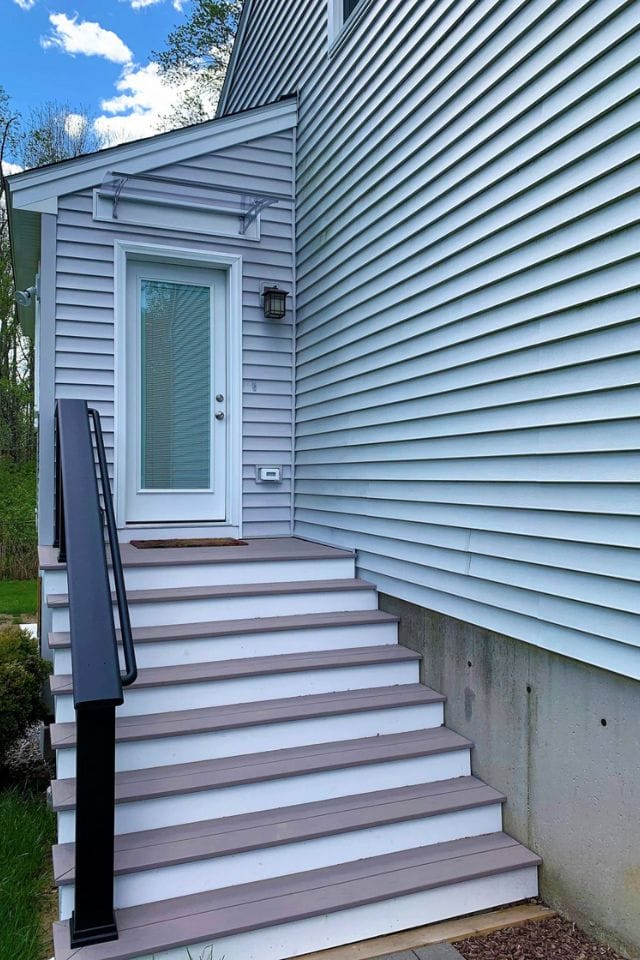 Features include: waterproof and durable vinyl plank flooring, low maintenance Azek and Timbertech composite/PVC entry stairs and deck, ProVia entry doors with blinds integrated in the glass. They added their own personal touches with a decorative privacy PVC fence on the deck, bright colors and photos, truly making this new addition feel like a part of the home!